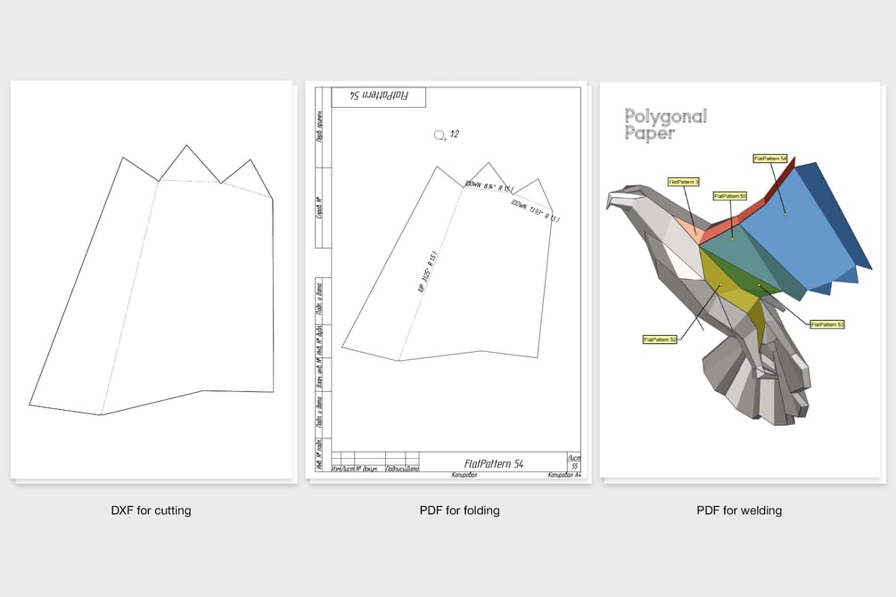When we designing low poly sculptures for assembly from metal, we take into account the thickness of the sheet metal (1.5 mm) and k-factor (coefficient of displacement during bending). The inner bend radius is 1.5 mm. We try to do all the welding on the outside so that the assembled model is as accurate as possible. We recommend using laser cutting and bending machine. But some of our customers cut and bend parts by hand - it takes much longer. Drawings are suitable for any style of work.
