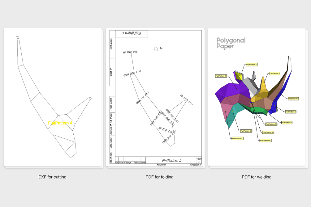When we designing low poly sculptures for assembly from metal, we take into account the thickness of the sheet metal (1.5 mm) and k-factor (coefficient of displacement during bending). The inner bend radius is 1.5 mm. We try to do all the welding on the outside so that the assembled model is as accurate as possible. We recommend using laser cutting and bending machine. But some of our customers cut and bend parts by hand - it takes much longer. Drawings are suitable for any style of work.