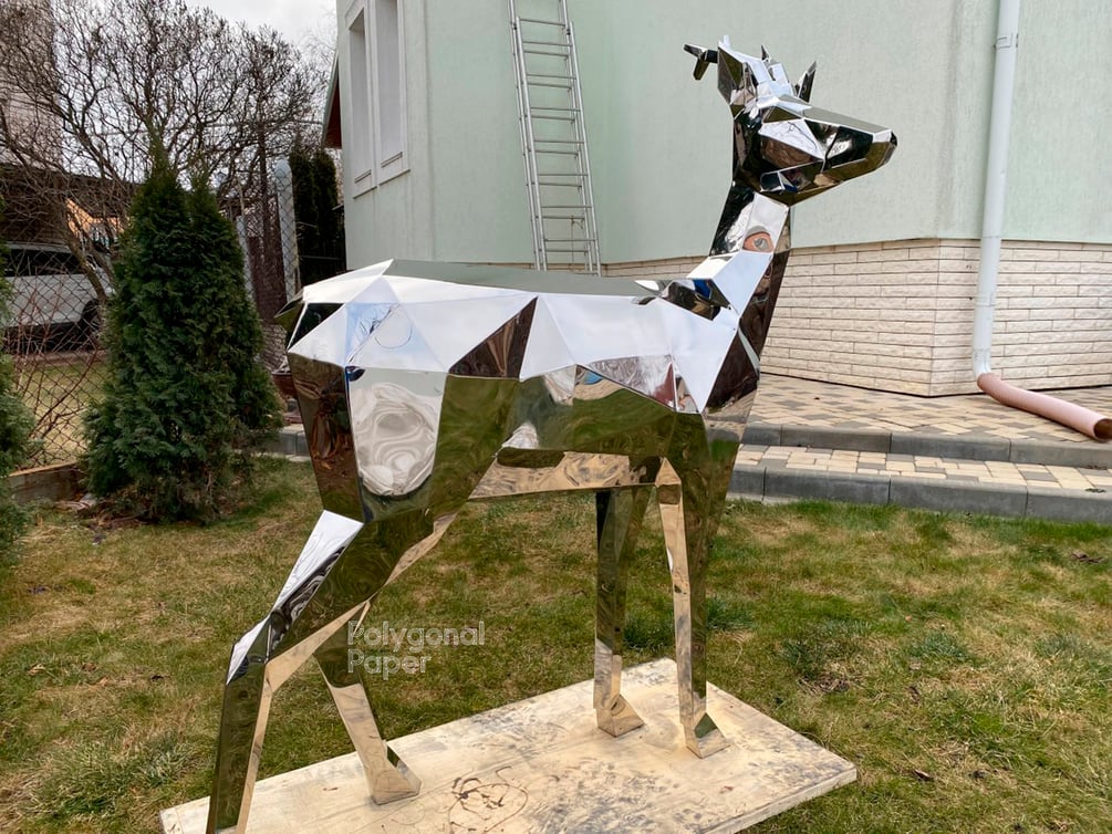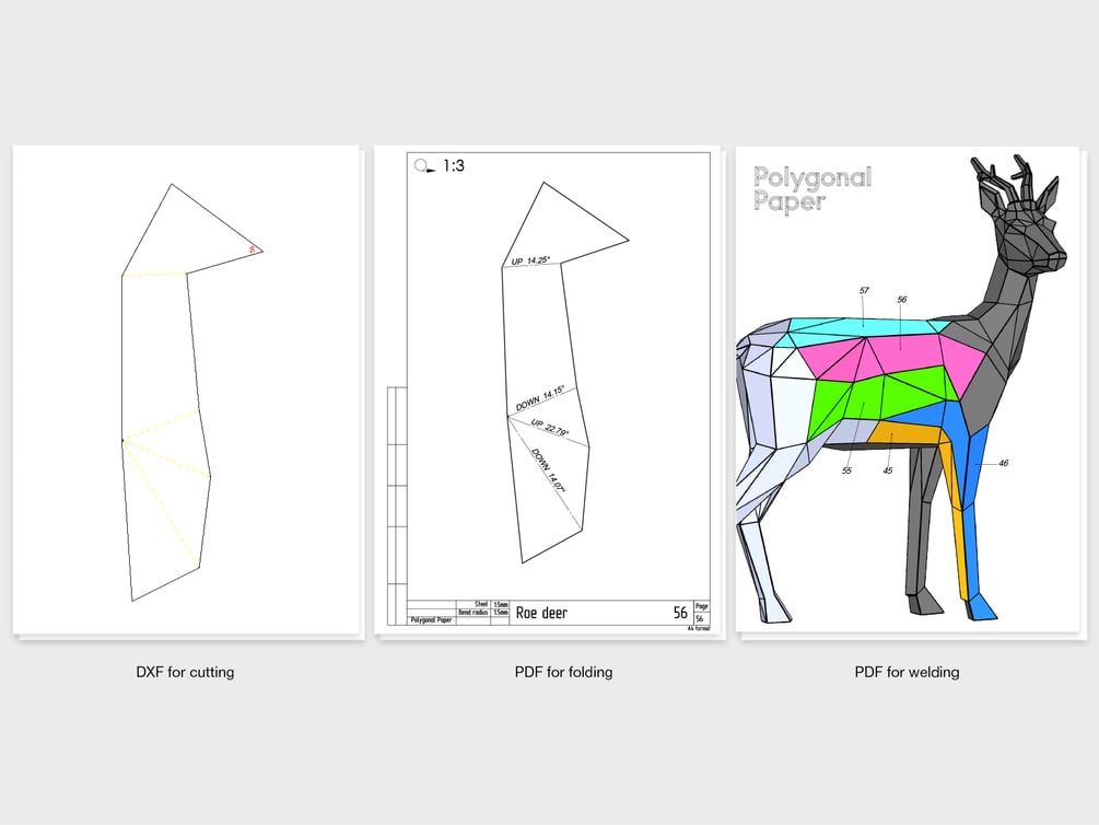 When we designing low poly sculptures for assembly from metal, we take into account the thickness of the sheet metal (1.5 mm) and k-factor (coefficient of displacement during bending). The inner bend radius is 1.5 mm. We try to do all the welding on the outside so that the assembled model is as accurate as possible. We recommend using laser cutting and bending machine. But some of our customers cut and bend parts by hand - it takes much longer. Drawings are suitable for any style of work.