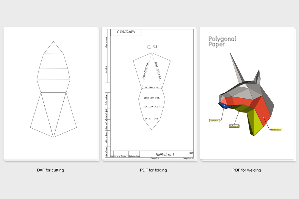 When we designing low poly sculptures for assembly from metal, we take into account the thickness of the sheet metal (1.5 mm) and k-factor (coefficient of displacement during bending). The inner bend radius is 1.5 mm. We try to do all the welding on the outside so that the assembled model is as accurate as possible. We recommend using laser cutting and bending machine. But some of our customers cut and bend parts by hand - it takes much longer. Drawings are suitable for any style of work.
