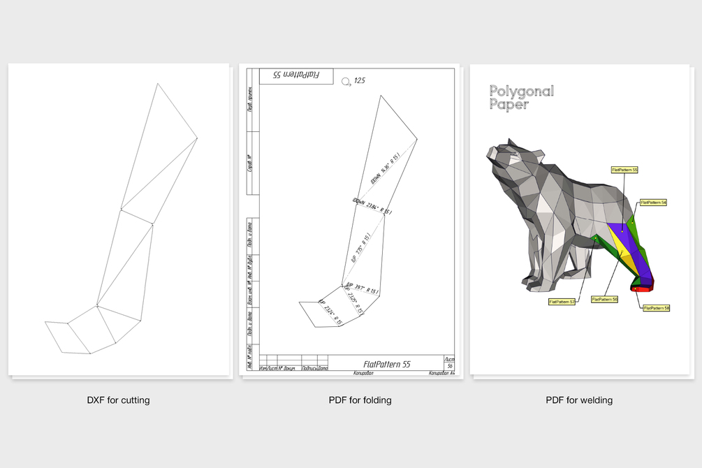When we designing low poly sculptures for assembly from metal, we take into account the thickness of the sheet metal (1.5 mm) and k-factor (coefficient of displacement during bending). The inner bend radius is 1.5 mm. We try to do all the welding on the outside so that the assembled model is as accurate as possible. We recommend using laser cutting and bending machine. But some of our customers cut and bend parts by hand - it takes much longer. Drawings are suitable for any style of work.